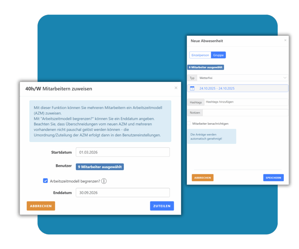 Die größte Schwierigkeit lag in der Abbildung der wechselnden Wochenmodelle und der saisonalen Schwankungen.Das Bauunternehmen arbeitete mit einer kurzen Woche (vier Arbeitstage, z. B. 30 Stunden) und einer langen Woche (fünf Arbeitstage, z. B. 45 Stunden). Diese Modelle sollten im System flexibel hinterlegt und einzelnen Mitarbeitenden oder Teams individuell zugeordnet werden können.