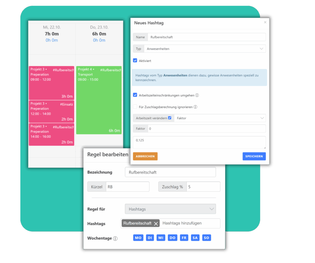 Das Unternehmen wollte die Rufbereitschaften seiner Mitarbeitenden klar und korrekt erfassen, ohne sie fälschlicherweise als reguläre Arbeitszeit zu werten. Dabei galt es, verschiedene Arten der Rufbereitschaft abzubilden: einfache Wochenendbereitschaften über 24 bis 72 Stunden, teilweise vergütete Bereitschaften sowie Sondereinsätze, die während einer laufenden Rufbereitschaft stattfinden.