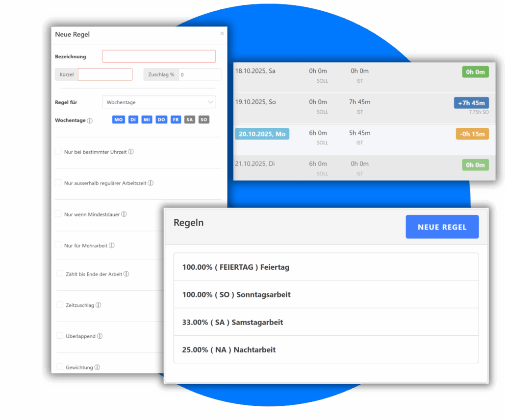 Über definierte Ausnahmeregeln lassen sich zudem Sonderfälle wie Feiertagsüberschneidungen flexibel steuern, etwa wenn ein Feiertag auf einen Sonntag fällt. In diesen Fällen entscheidet das System nach den hinterlegten Prioritäten, welcher Zuschlag angewendet wird.