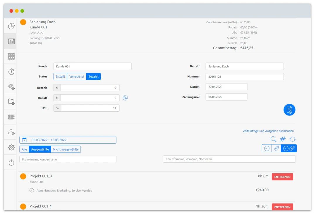 TimeTrack bietet eine präzise Projektzeiterfassung. Durch die genaue Abrechnung aller Kosten und Ausgaben behalten Sie stets den Überblick über den Aufwand für jeden Auftrag.