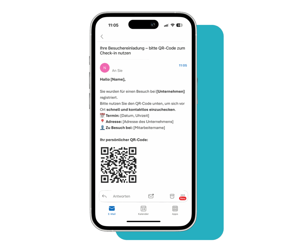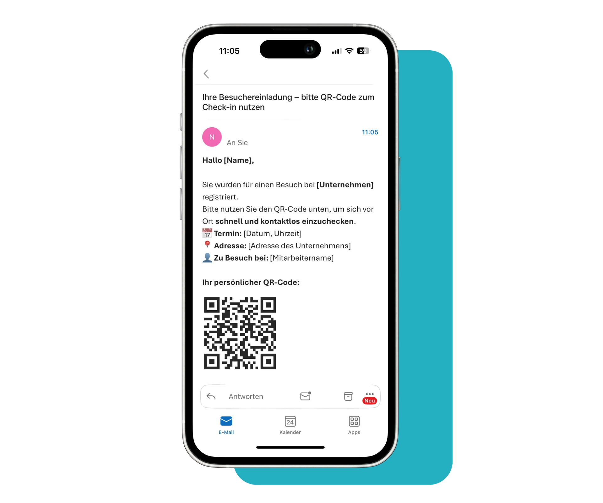 Bereits vor dem Besuch erhalten Gäste automatisch eine Einladung per E-Mail mit Registrierungslink und können ihre Daten bequem vorab ausfüllen. Die Besuchermanagement Lösung erstellt dabei automatisch den persönlichen QR-Code und einen ICS-Kalendereintrag  Individuell anpassbare Formulare, automatisierte E-Mails und die direkte Übernahme in die Besucherliste sorgen für einen reibungslosen Ablauf – von „Eingeladen“ über „Registriert“ bis „Eingecheckt“.