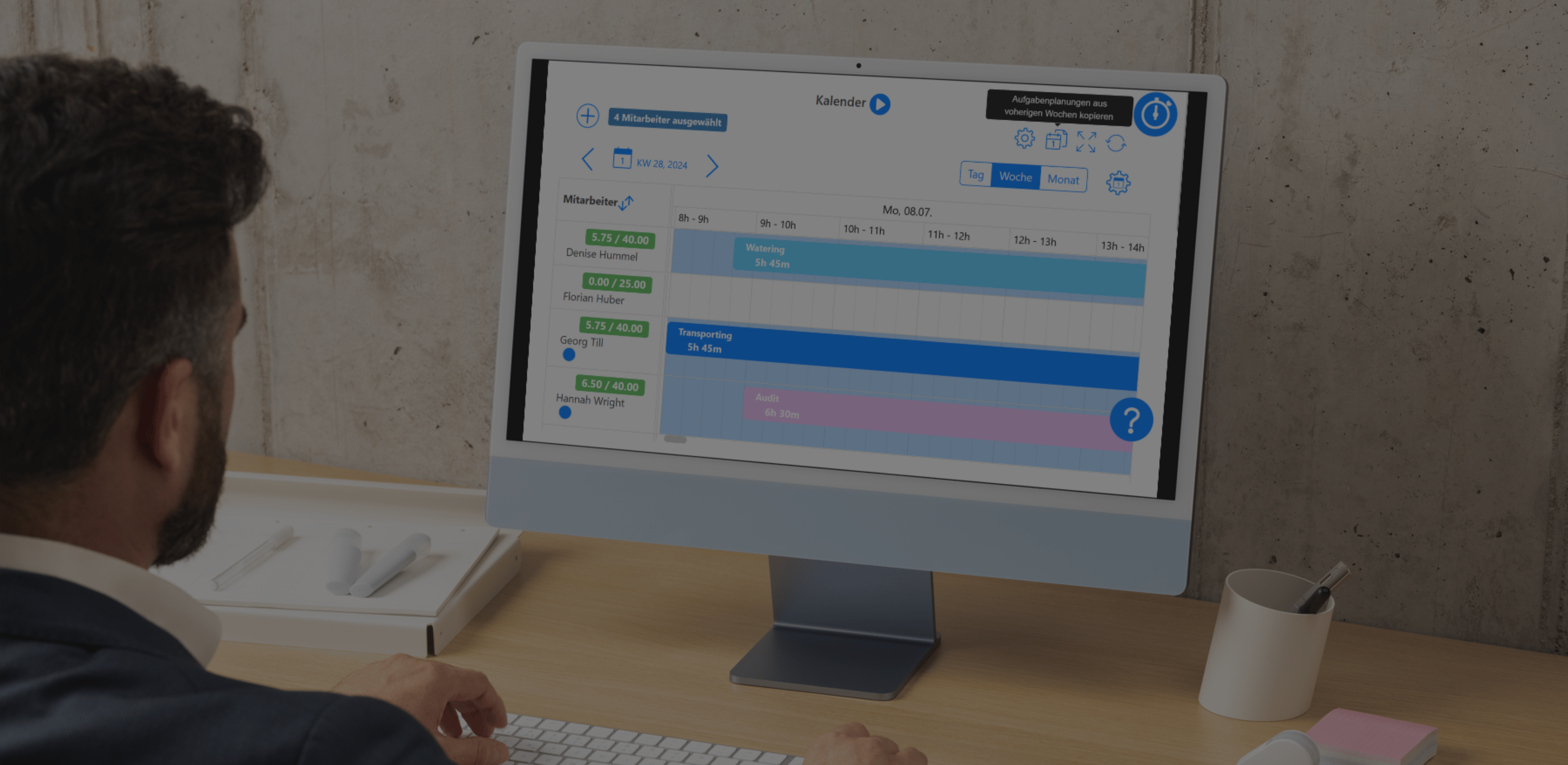 Personalplanung → Aufgabenplanung → Kalender → Wochenansicht → zwei Kalender-Icon
