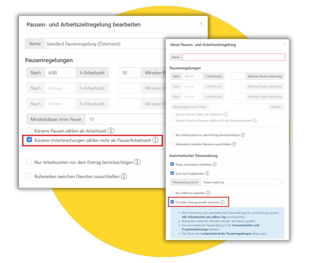 Damit lassen sich kurze Unterbrechungen flexibel an die internen Unternehmensregeln anpassen, ohne die gesetzliche Pausenberechnung zu beeinflussen.