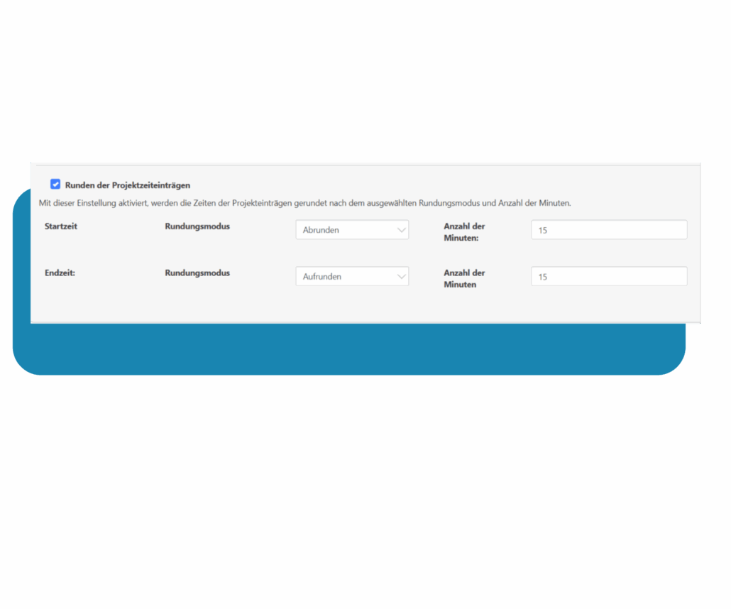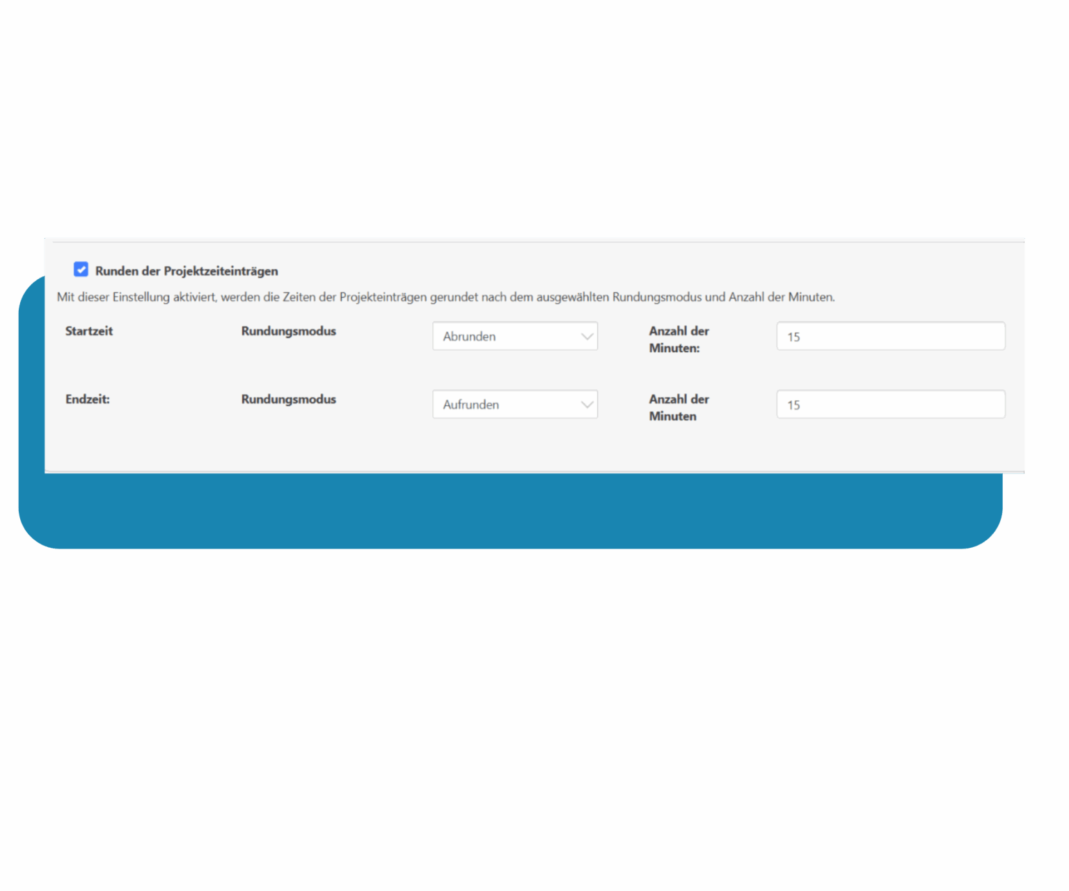 Unternehmen können selbst festlegen, wie die Rundung erfolgen soll – zum Beispiel auf 5-, 10- oder 15-Minuten-Intervalle. Die Rundung wird direkt bei der Zeiteingabe bzw. -speicherung angewendet, sodass Mitarbeitende und Projektverantwortliche jederzeit einen klaren und standardisierten Überblick über die erfassten Projektstunden haben.