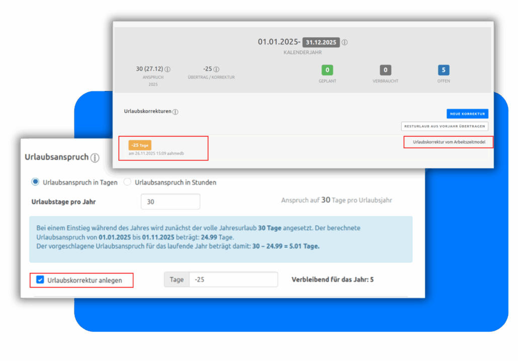 Das System berechnet den Urlaubsanspruch dabei automatisch auf Basis des Eintrittsdatums und des hinterlegten Arbeitszeitmodells. Dadurch entfällt die manuelle Nachberechnung und der Urlaubsstand wird von Beginn an korrekt und transparent dargestellt.