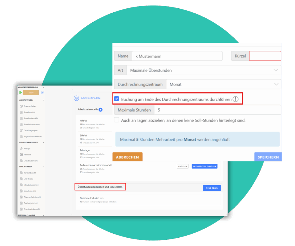 In Arbeitszeitmodellen kann jetzt eine Überstundenkappung aktiviert werden, die erst am letzten Tag des Monats wirksam wird. Dadurch wird während des laufenden Monats keine vorzeitige Kürzung angezeigt, sondern erst zum Monatsende automatisch berechnet. Diese Funktion ist besonders hilfreich für Unternehmen, die mit festen Obergrenzen für monatliche Überstunden arbeiten und eine klare, zusammenhängende Monatsabrechnung benötigen.