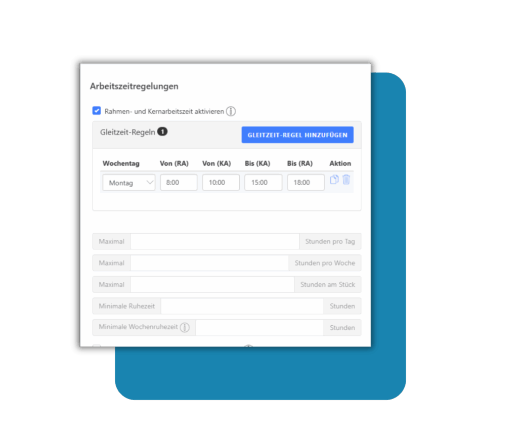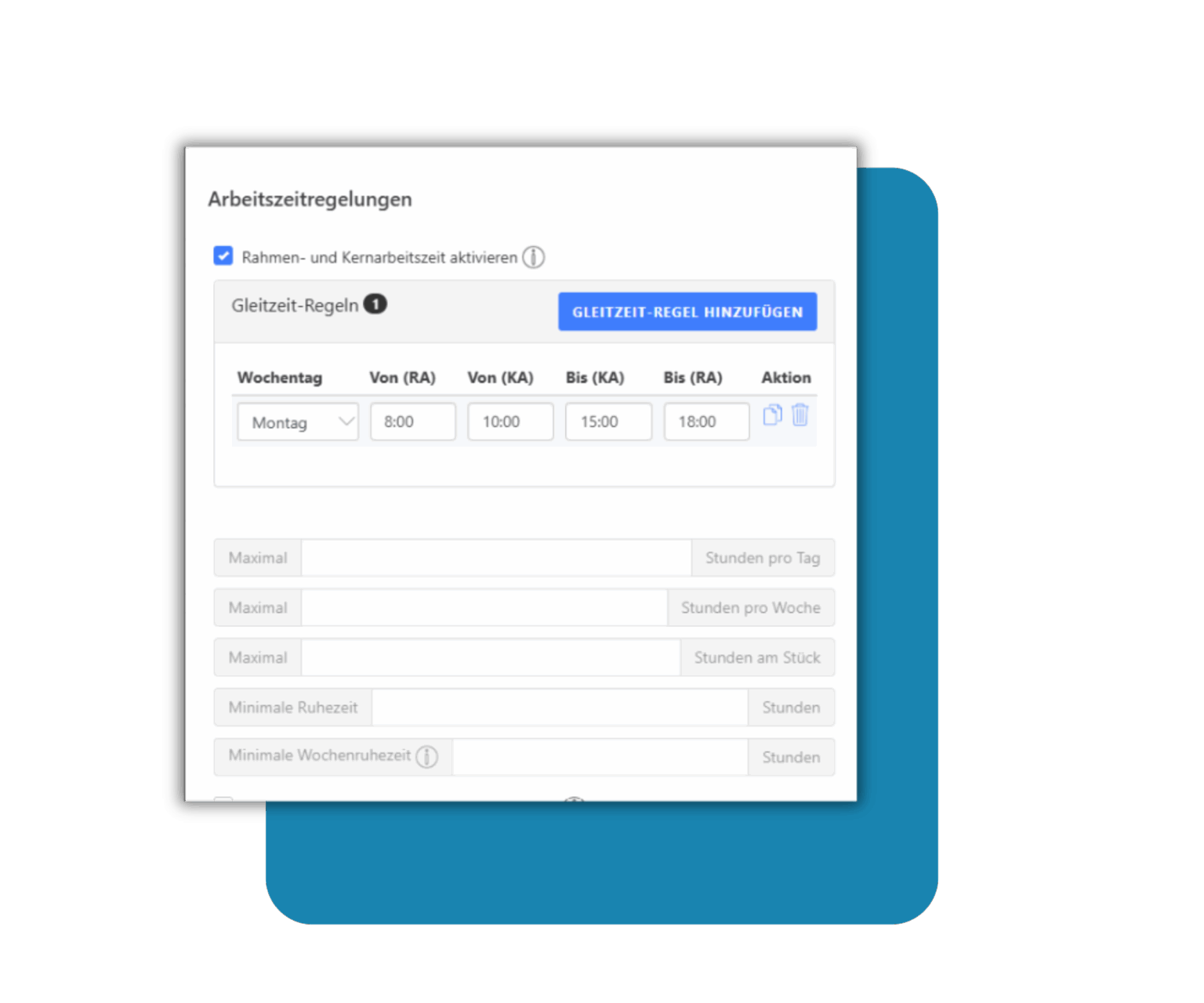 Allgemein → Arbeitszeiterfassung → Pausen- und Arbeitszeitregelungen → Rahmen- und Kernarbeitszeit aktivieren