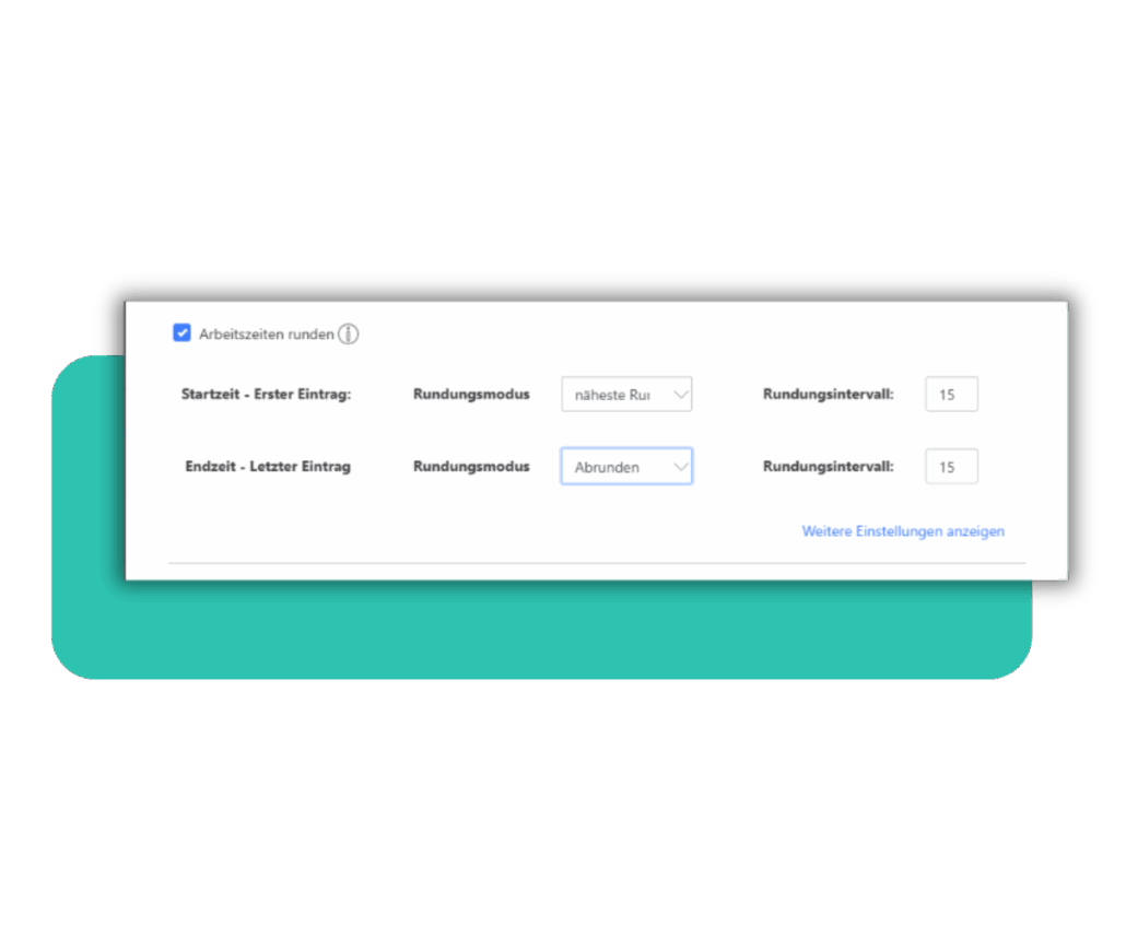 Einstellungen → Arbeitszeiterfassung → Allgemein → Arbeitszeitmodelle → runden.