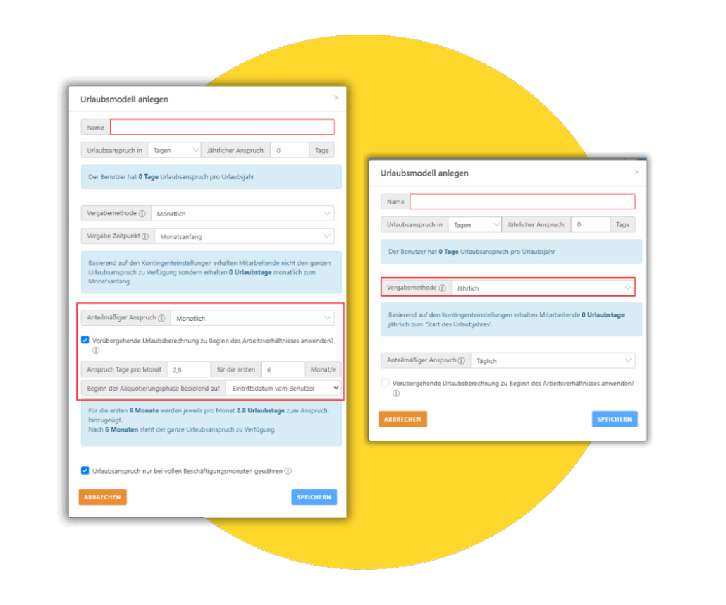 Die Verwaltung von Urlaubsansprüchen wird mit diesem Update deutlich flexibler. Sie können nun spezifische Urlaubsmodelle (z. B. für verschiedene Länder) definieren und festlegen, ob Ansprüche jährlich oder monatlich(z. B. 2,18 Tage) gewährt werden. Besonders hilfreich für die Personalplanung: Der Urlaubsanspruch lässt sich für die Probezeit einschränken (z. B. erst nach 6 Monaten) oder so konfigurieren, dass er nur für volle Beschäftigungsmonate ab dem Eintrittsdatum berechnet wird.