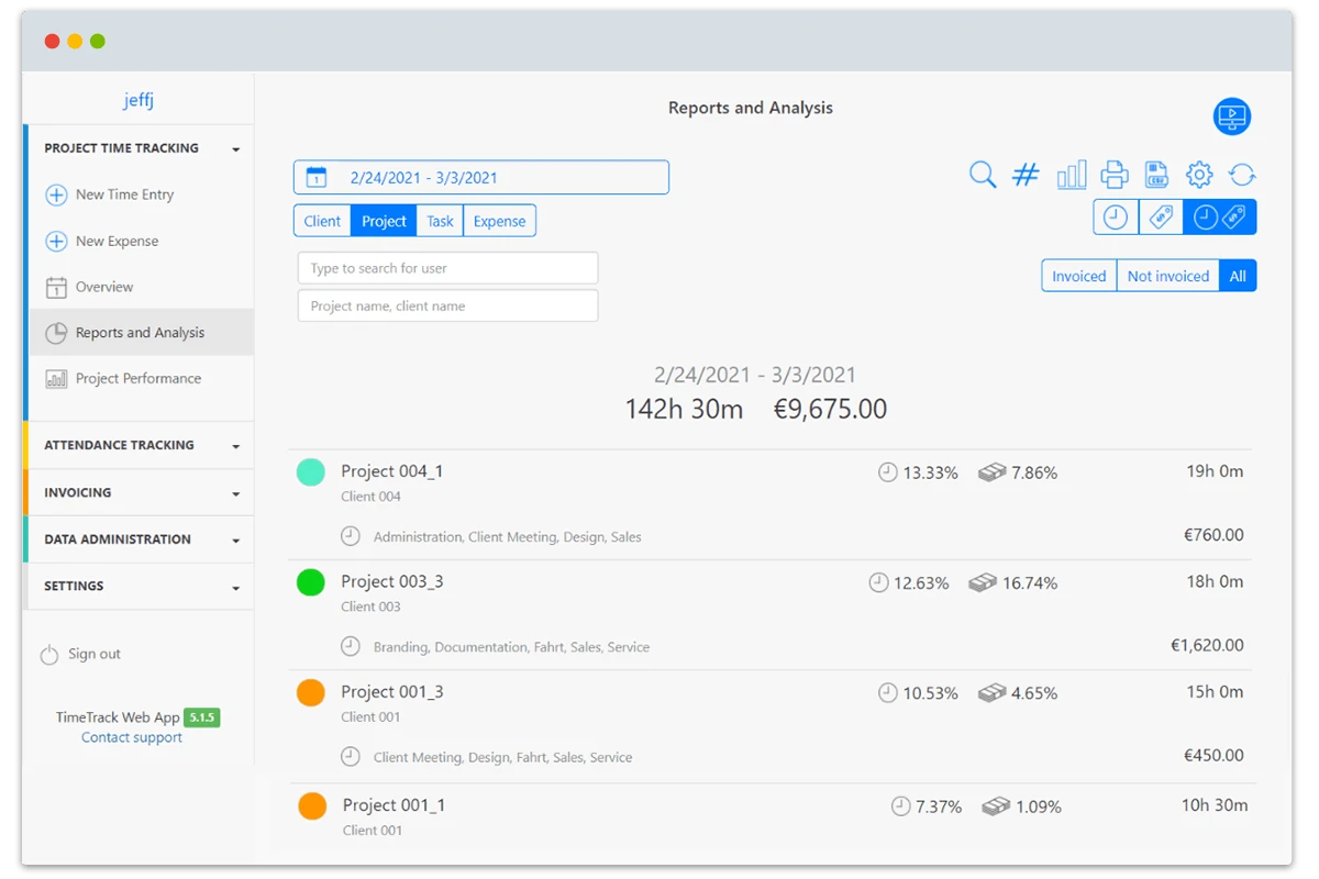 Define the target and set the planned project duration or budget – that’s all TimeTrack needs to track project progress. Has too little or too much money and/or time been spent on the project? You will find out immediately! The target/actual comparisons show you which projects are efficient and which are inefficient. Get an overview of your resources and the profitability of your projects to optimize the work processes of your office. Additionally, upload project-relevant documents and files so that employees can access them at any time. Whether on a PC, Mac or smartphone – all data is stored in a central location and is available at all times.