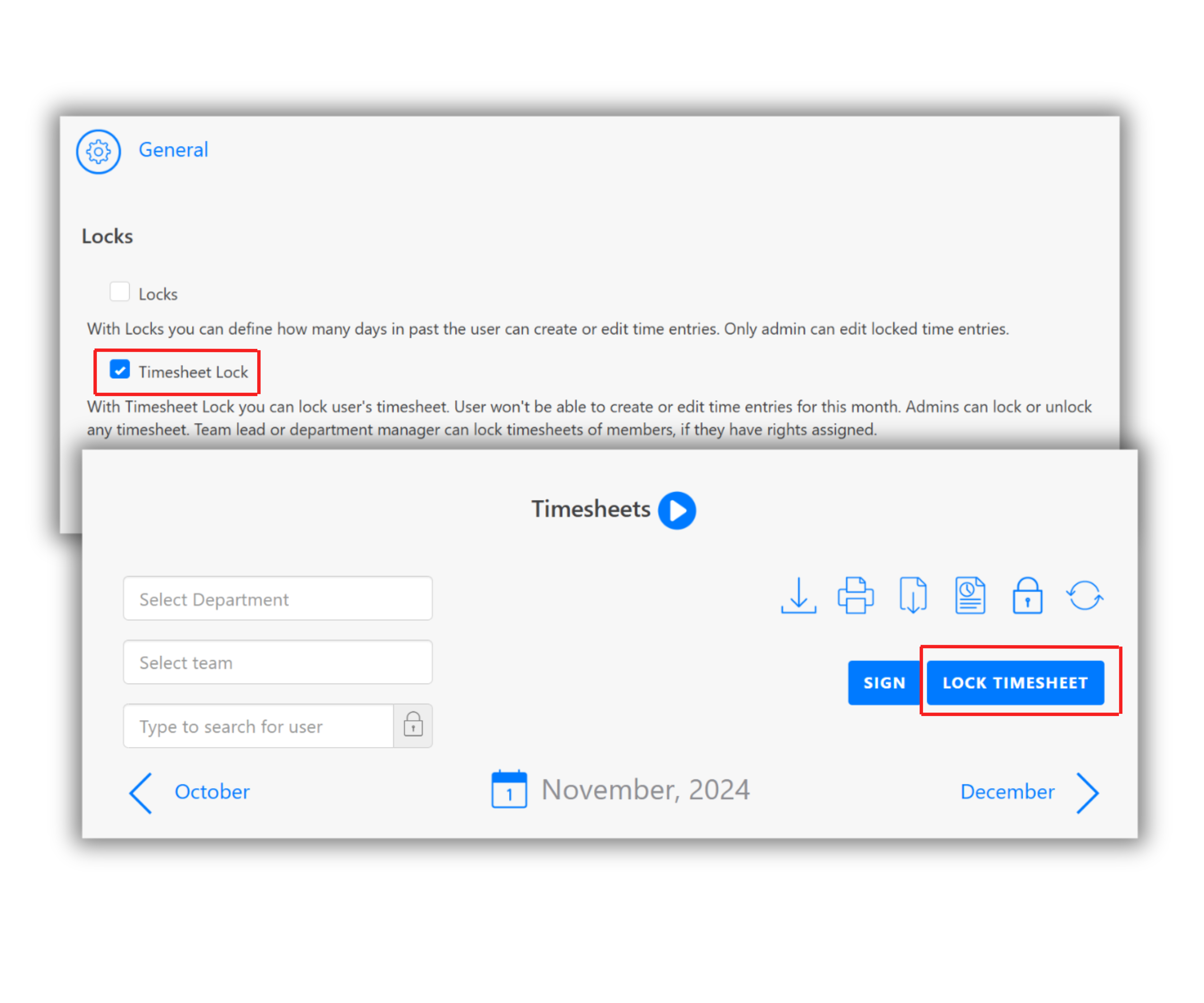 First, the timesheet lock must be enabled. Go to Settings > Attendance and Leave > General to activate the locks, and under “Timesheets,” you can lock an employee’s timesheet for a specific month. You can also do this for multiple employees by clicking the closed lock icon.