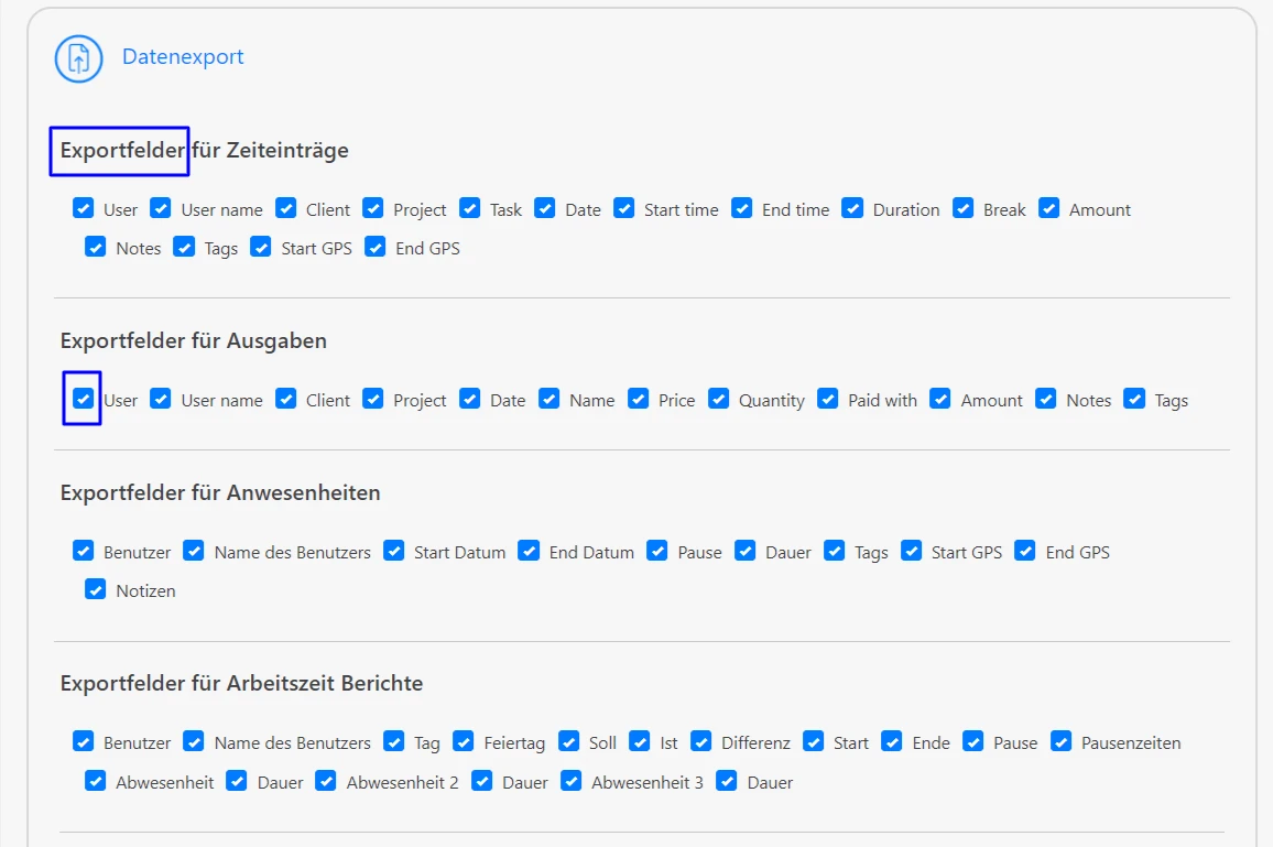 Den CSV Export für Zeiteinträge, Ausgaben, Anwesenheiten und Arbeitszeit Bericht können Sie individuell nach Ihren Bedürfnissen konfigurieren. Unter Einstellungen > Allgemein > Datenexport finden Sie für die aufgezählten Features eine Auswahl an Exportfelder.