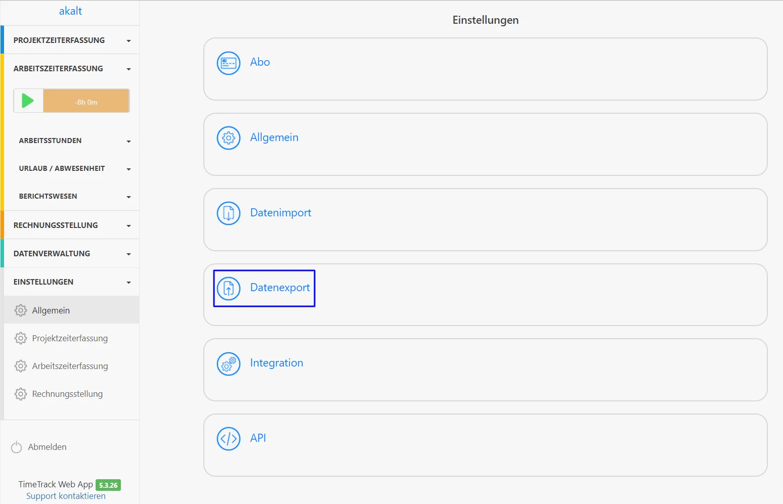 Sie benötigen ein TimeTrack Cloud Konto – dieses legen Sie direkt in der Pro oder Free App an. Gehen Sie in der Web-App des Cloud Kontos auf Einstellungen / Datenexport.