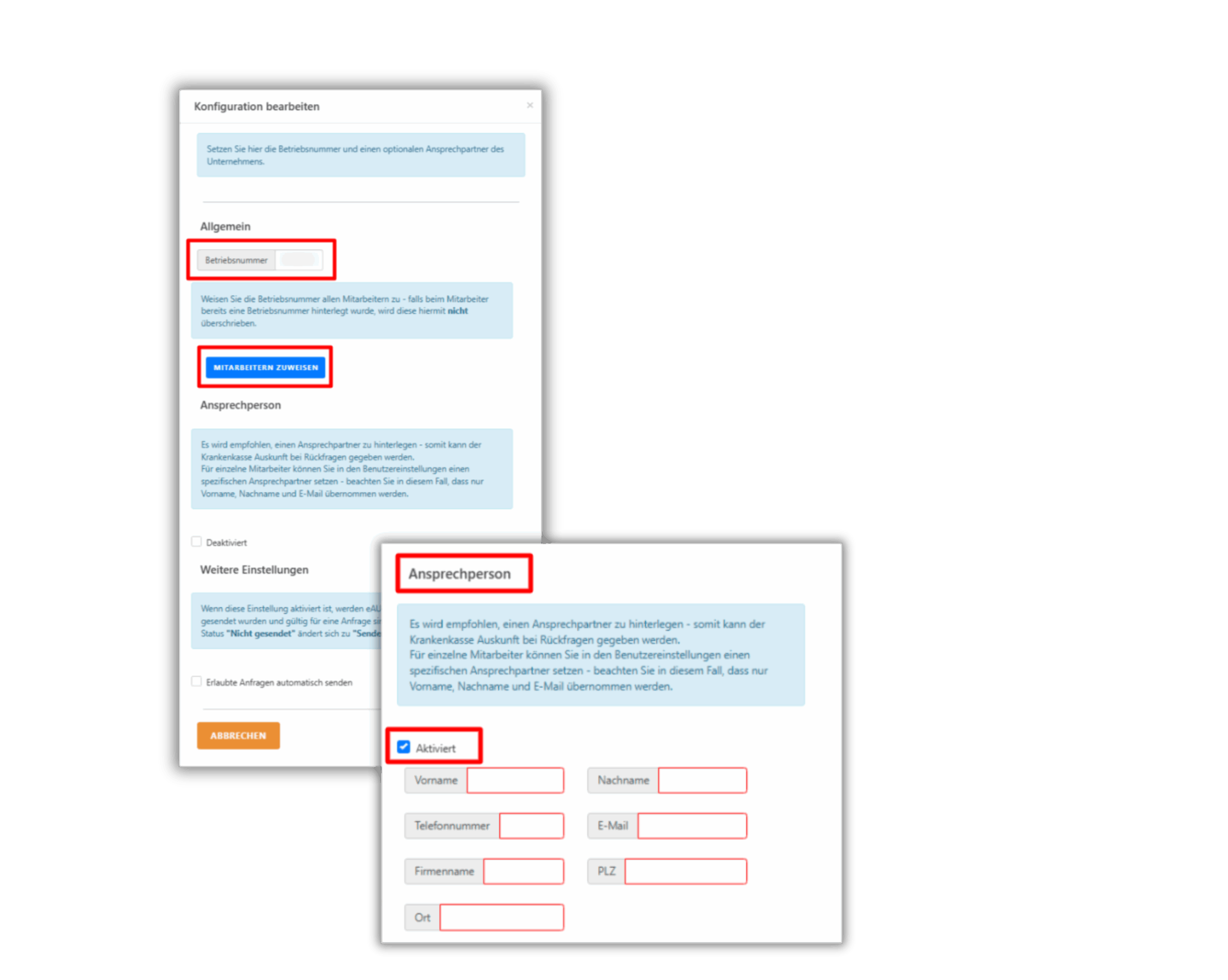 • Ansprechperson (Optional): Sie können optional eine Kontaktperson hinterlegen, damit die Krankenkasse bei Rückfragen direkt Kontakt aufnehmen kann.