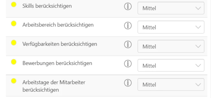 Mit diesem Kriterium können Sie angeben, wie wichtig es für Sie ist, dass Bewerbungen von Mitarbeitern bzw. Mitarbeiterinnen auf einzelne Schichten berücksichtigt werden.