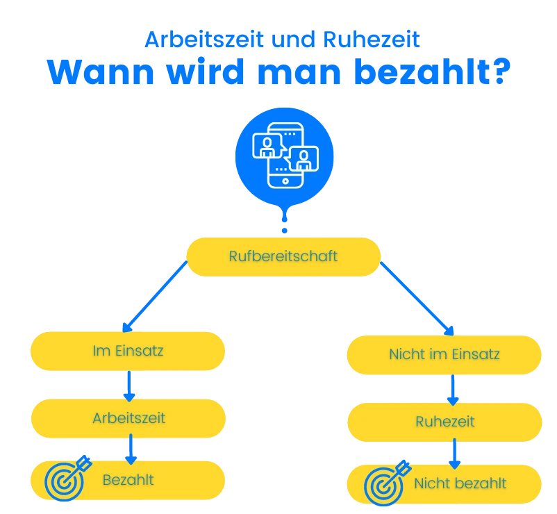 Bei der Rufbereitschaft unterscheidet man zwischen der Arbeitszeit und der Ruhezeit. Falls in der Rufbereitschaft die Dienste des Mitarbeiters bzw. der Mitarbeiterin nicht benötigt wurden, zählt diese Zeit als Ruhezeit. Da Ruhezeiten normalerweise nicht bezahlt werden und Rufbereitschaften bei nicht entsprechender Bezahlung für Arbeitnehmer:innen unattraktiv sind, wird meistens eine Pauschale festgelegt. Je nach Arbeitsvertrag variieren die Höhe der Bezahlung.
