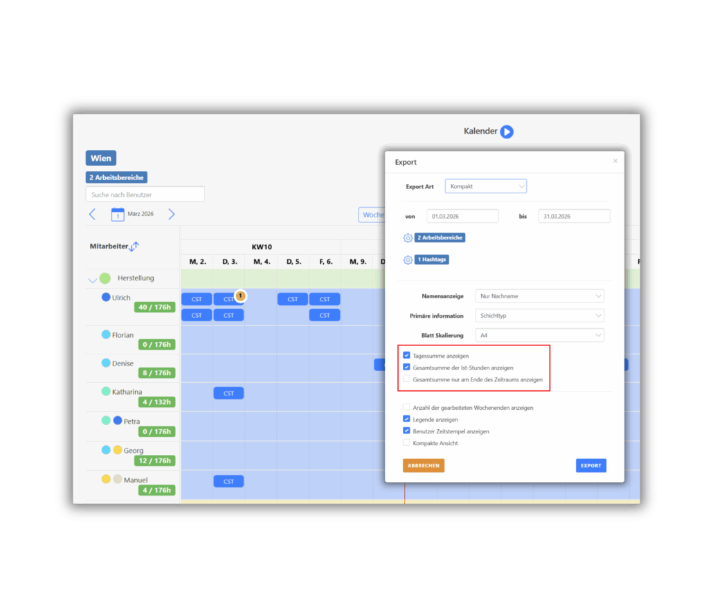 Nutzen Sie den Dienstplan-Export in der Kompaktansicht, um Ihre Planung im Handumdrehen als professionelle Übersicht auszugeben. Ob für den digitalen Versand oder als Aushang vor Ort, der Export ist für maximale Lesbarkeit optimiert.
