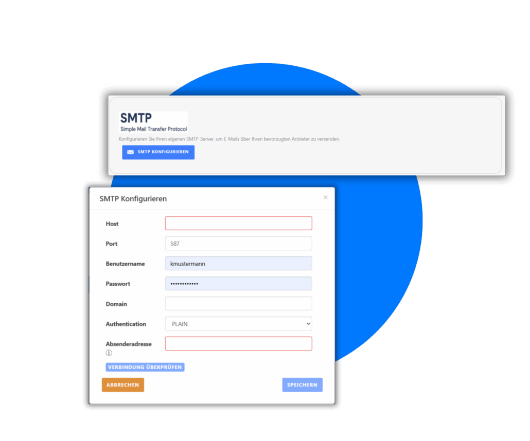 Klicken Sie auf die Schaltfläche „SMTP konfigurieren“. Geben Sie dort Ihre spezifischen Mailserver-Daten ein: Host, Port, Benutzername sowie das zugehörige Passwort.
