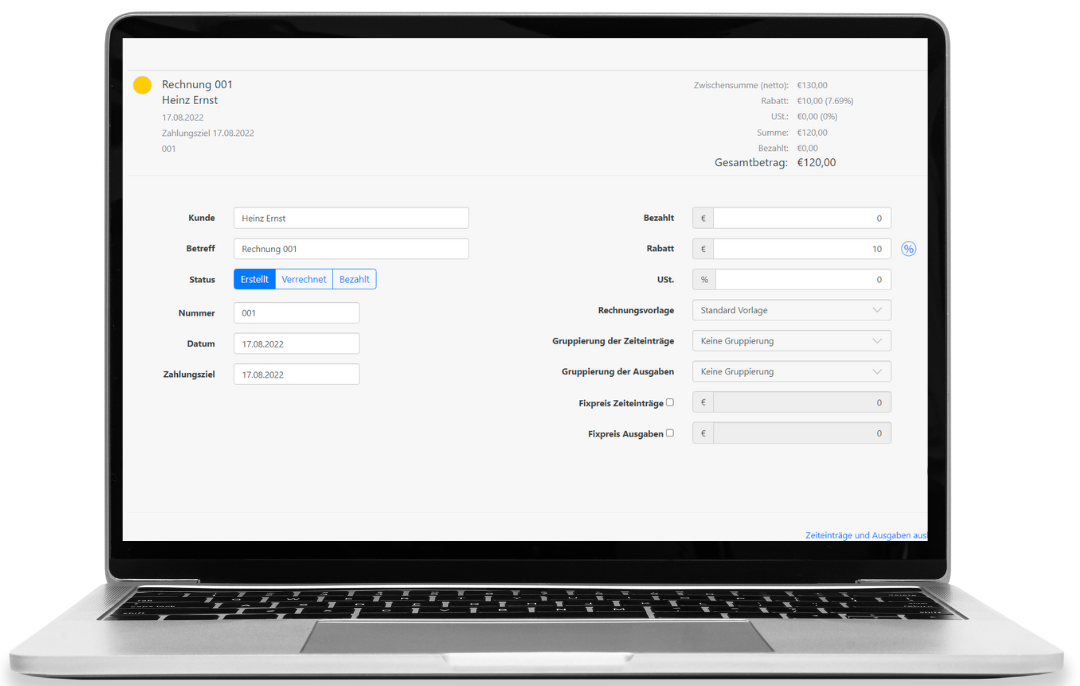 Sparen Sie sich Zeit bei der Rechnungsstellung und profitieren Sie von der Abrechnung von TimeTrack! Die digitale und einfach zu bedienende Lösung ist nicht nur personalisierbar, sondern schafft auch den perfekten Überblick über alle erbrachten Leistungen