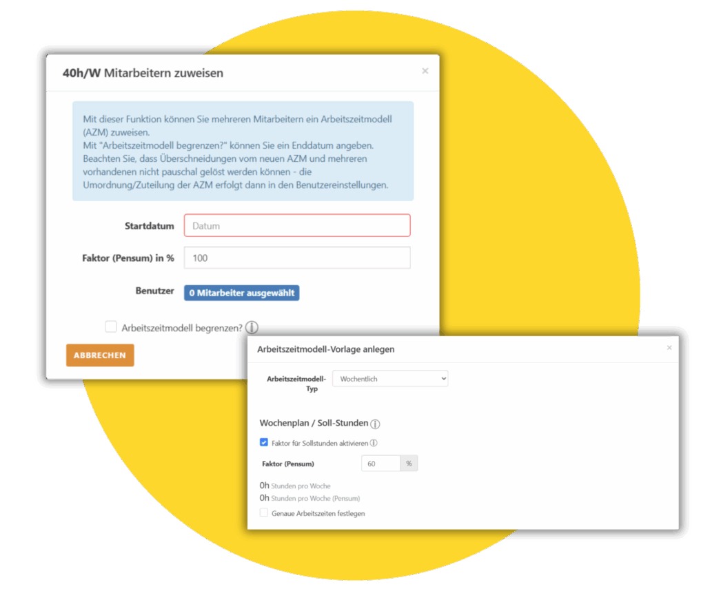 In TimeTrack wird das Pensum direkt im Arbeitszeitmodell hinterlegt. Das System berechnet Sollstunden und Abwesenheiten automatisch und revisionssicher – perfekt für korrekte Zeiterfassung in Schweizer Unternehmen.