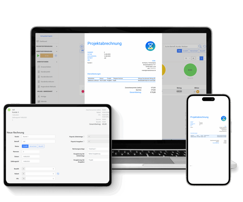 Mit TimeTrack wird die Rechnungsstellung so einfach wie nie zuvor. Dank individuell anpassbarer Abrechnungsvorlagen erstellen Sie Rechnungen im Corporate Design Ihres Unternehmens. Professionell, transparent und in kürzester Zeit.