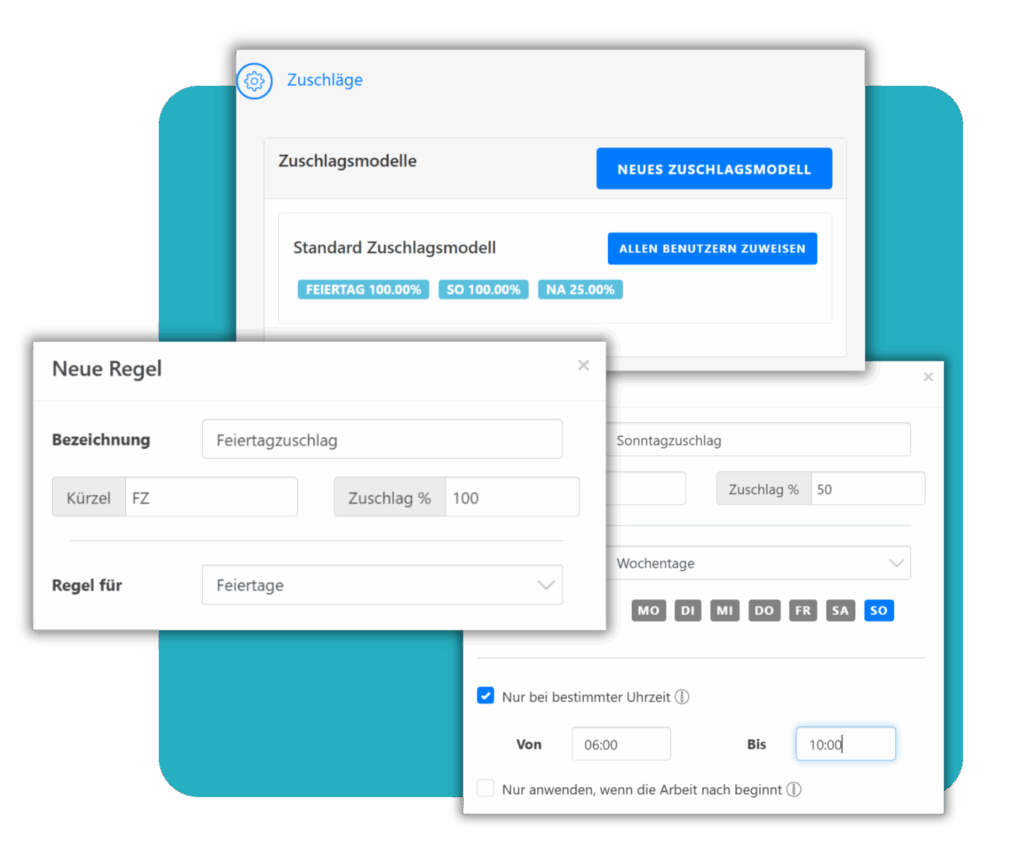 Zuschläge können in vielen Zeiterfassungssystemen als Regeln hinterlegt werden, die automatisch angewendet werden. Dabei werden Uhrzeiten, Kalendertage und Arbeitsdauer berücksichtigt. So ist keine manuelle Nachbearbeitung nötig und Zuschläge werden zuverlässig berechnet.